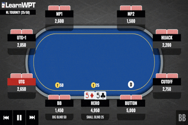 这手牌我们在小盲位置拿着口袋对子55面对CO玩家的加注。为了用这手投机牌跟注,我们应该确保自己得到正确的潜在底池赔率。