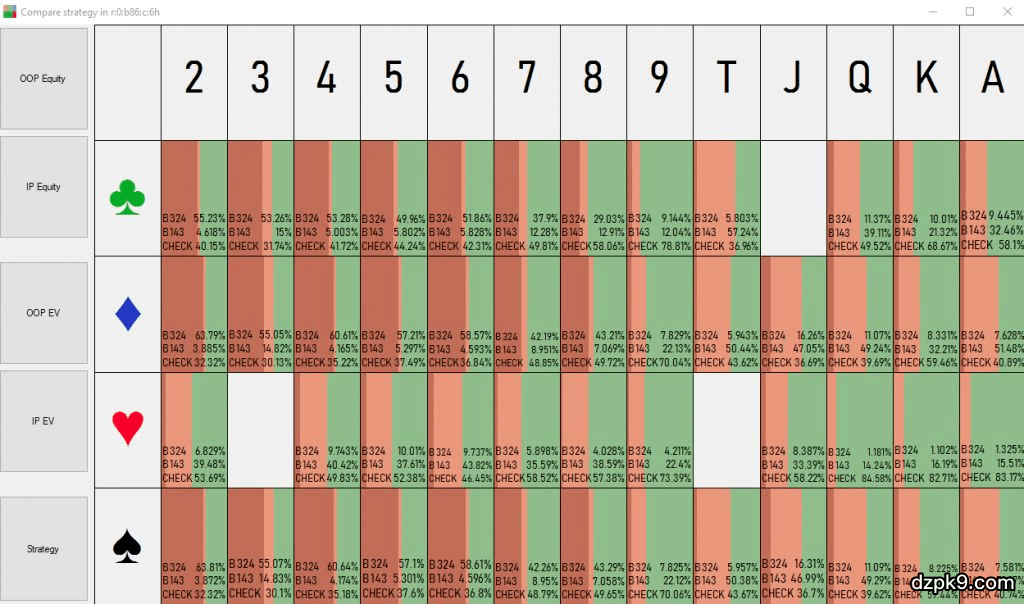 我们可以使用这个功能在一个视图内快速查看哪些转牌可以下注,下注多少以及用什么频率。你可以在这里看到:一个大点数的红桃发出时,在15%的时候做小额下注,85%的时候check;而一张小点数的空白牌发出时,在约55%的时候做大额下注,且从不做小额下注。这是你可以看到一个策略全貌(包括转牌圈和河牌圈)的唯一地方,因此你着重关注那些让你最吃惊的情况。