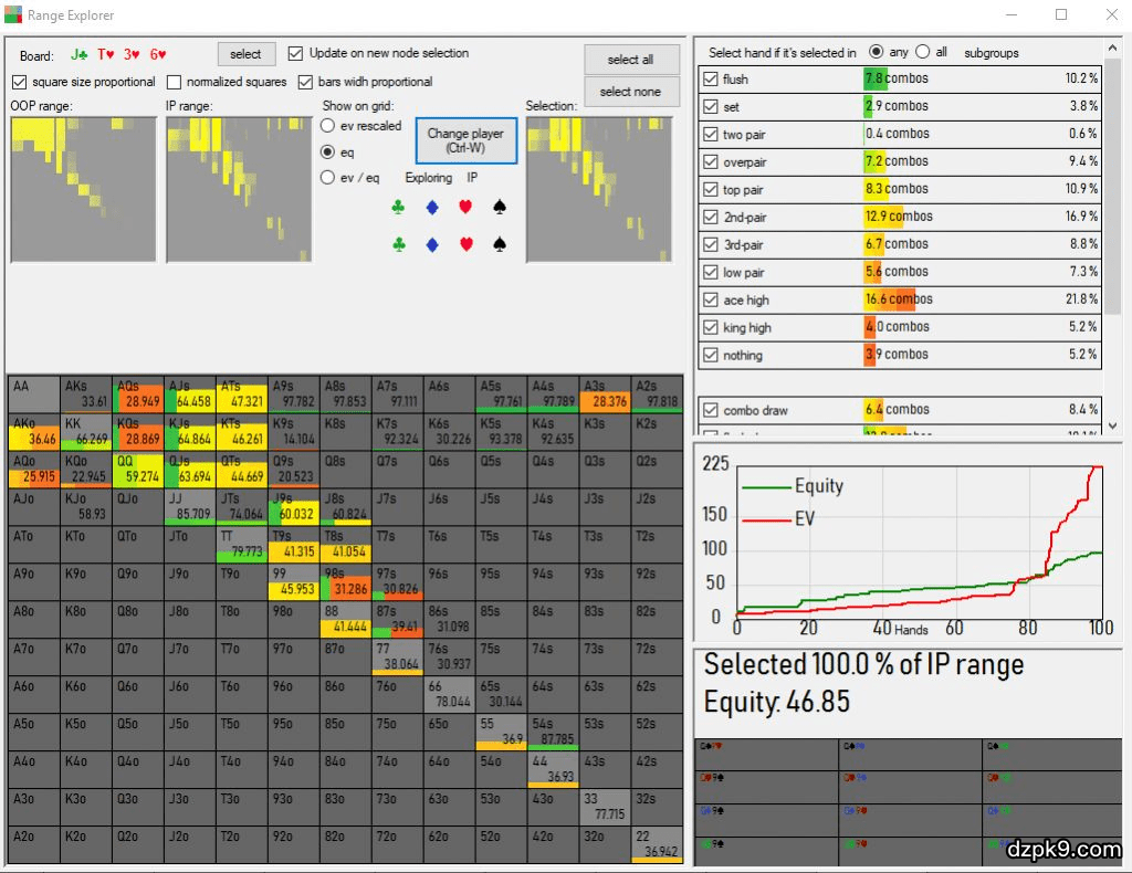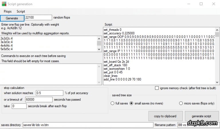如果你满意你的树结构,而且你想要运行大量不同翻牌结构的仿真测试,脚本是唯一的途径。在脚本生成面板(script generation panel)你可以选择生成X个随机翻牌面,载入预置(pre-installed)的翻前子集(subset),或者你追求完美,运行所有22100个翻牌面的仿真测试。你也可以设置精确度,选择保存多少个解决方案(值得注意的是,完整保存将是少量保存的大约10倍大小),指定保存位置,如果你的机器容易过热,设置一个休闲间隔时间。如果你使用得当,脚本运行是一个超强大的功能,但我对于新手的建议是,首先做小规模仿真测试,并专注于从每个求解中学到最多知识,而不是试图一下子解决所有问题。