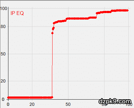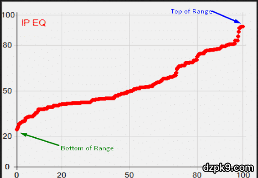 由图可见,直线范围各部分在翻牌圈的赢率,彼此之间的过渡很平缓,这个范围底部最差的牌型,赢率约为25%,曲线从左往右,随着牌力的慢慢提升,范围头部牌型的赢率达到最高点。
