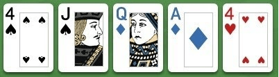 我们的对手用递增加注连开三枪,他的合理价值范围我们可以假设为AA、KK或者Qx,这也是一个可能有两对、三条和顺子的牌面。价值范围最边缘的部分是什么呢?