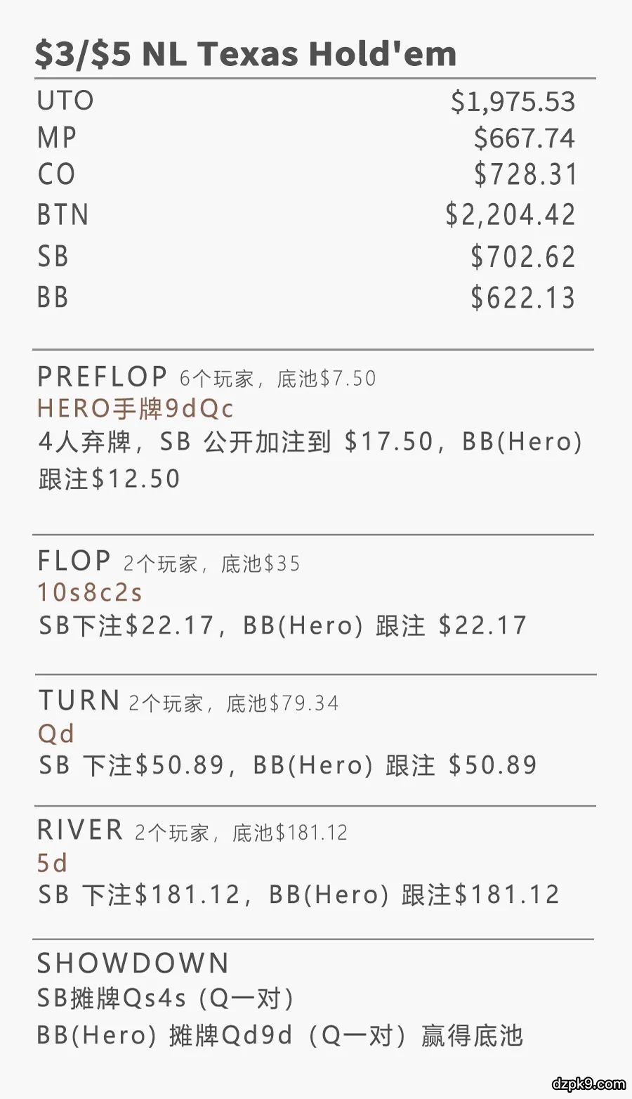Q是一张对SB有利的牌,我觉得SB会经常在Q的转牌连开两枪,即使是很弱的Q如果有黑桃听花的话也很可能打得很有侵略性,由于我没有对转牌再加注,因此Qx在河牌仍是强牌,这样看起来Qx依然可以在河牌拿到BB范围中10x和8x的价值。