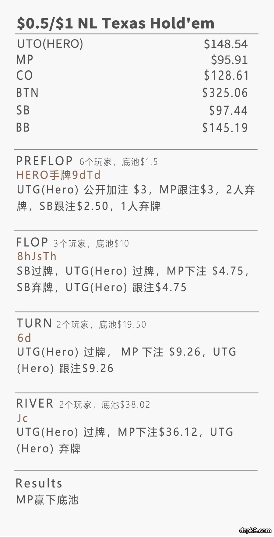 ⇒ 手牌Td9d没有阻挡对手听顺的KQ和红心听花,这些听牌都很有可能被对手拿来诈唬。