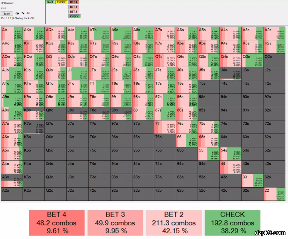 同样,我想选择一个和前一翻牌面类似的翻牌面:Q♠9♠4♥。以下是PioSolver软件的模拟: