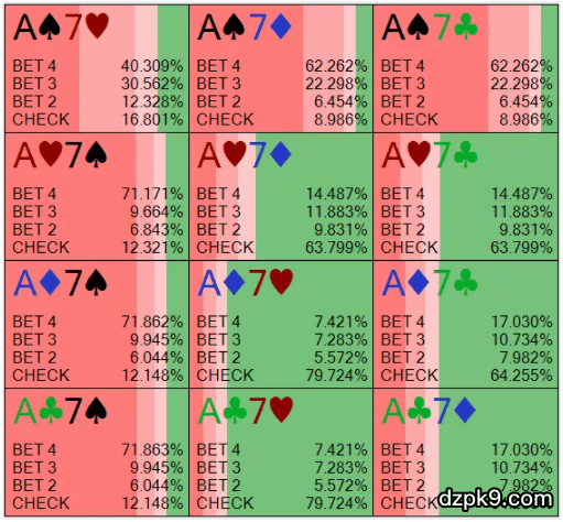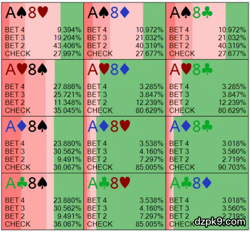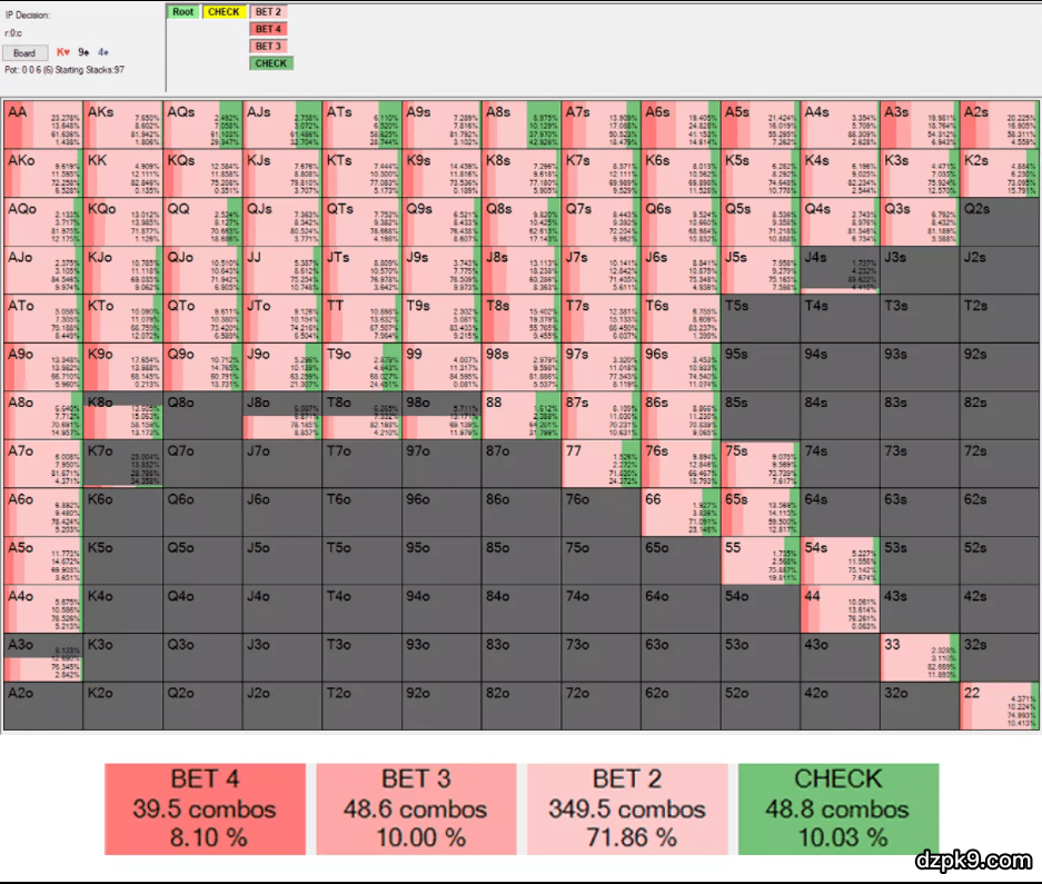 具体地说,如果你仔细观察A9o,你将看到Soler软件大多数时候都会用它过牌。但是,实际上你可以简化你的策略,在100%的时候用A9o以及A8o-A3o(Solver用它们极频繁地下注)下注。
