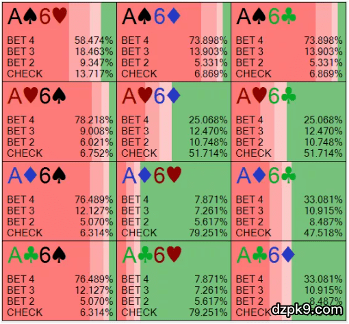 让我们将A9o(几乎只过牌)和A6o(几乎只下注)进行比较。