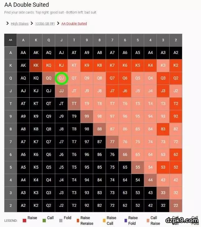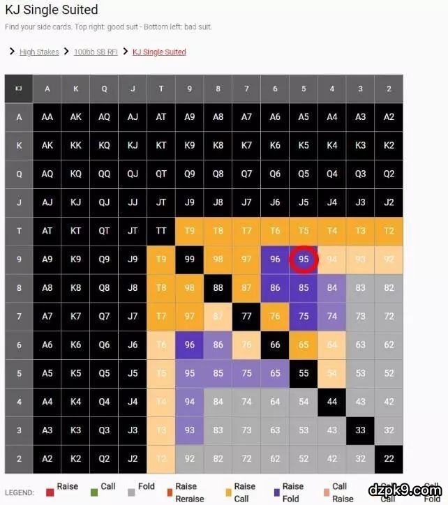 5. 在小盲位置游戏绝对是PLO翻前策略的最复杂部分。以下是单花KJ底牌在这种场合的解决方案: