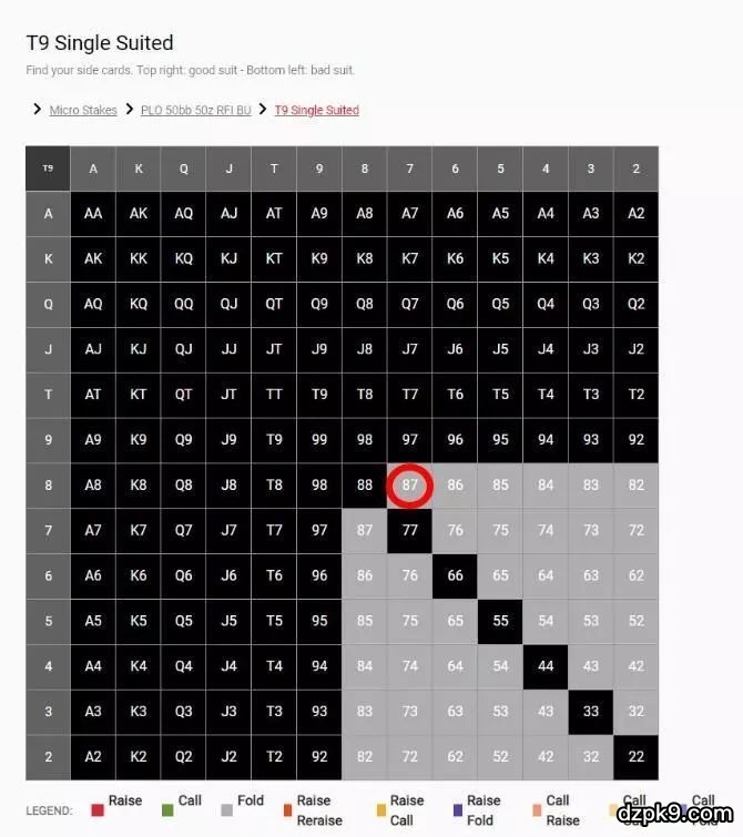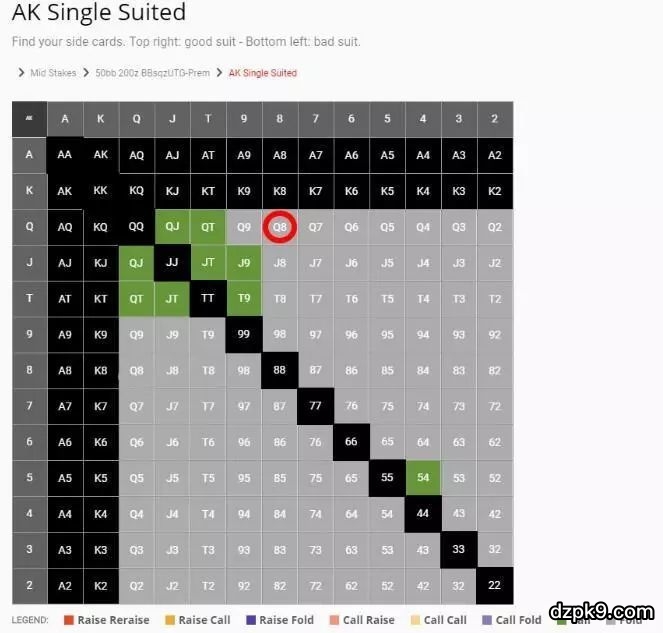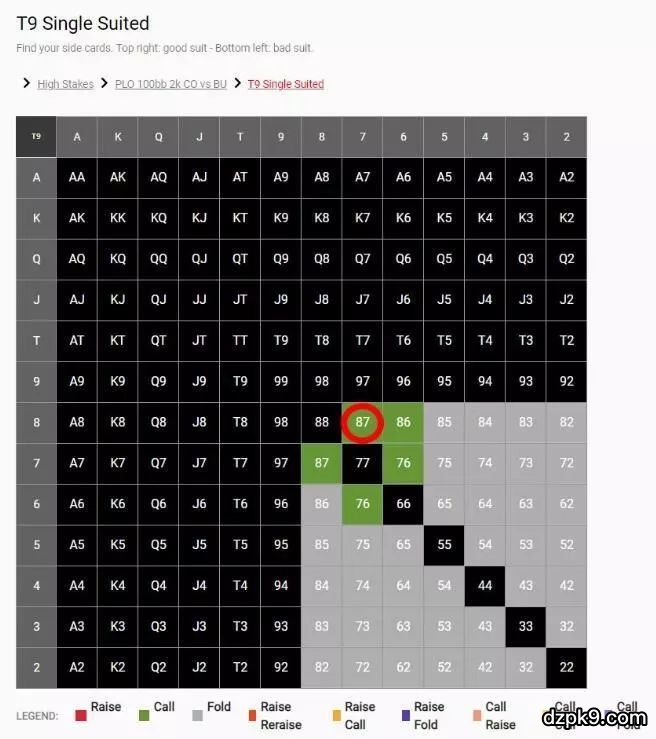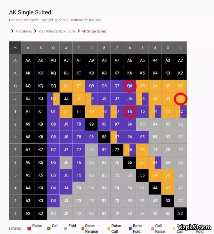 1. 带另外一张大牌的单花AK底牌应该总是在这个位置加注。这些牌往往能做成顶大两对或带坚果同花听牌的顶对。当你面对一个3bet时,是否有一个张“轮子牌”(译注:A-5之间的牌)造成了很大的决策差异。你应该用带轮子牌的底牌raise-call,用不带轮子牌的底牌raise-fold。以下是PLO Matrix软件对于这种场合的解决方案: