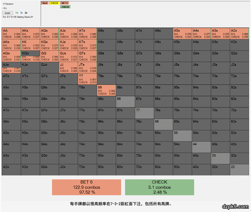 这种场合类似于我们在不利位置的3bet底池场合。决定性因素是相同的:你在几乎每个可以想象的翻牌面都有一种范围优势。
