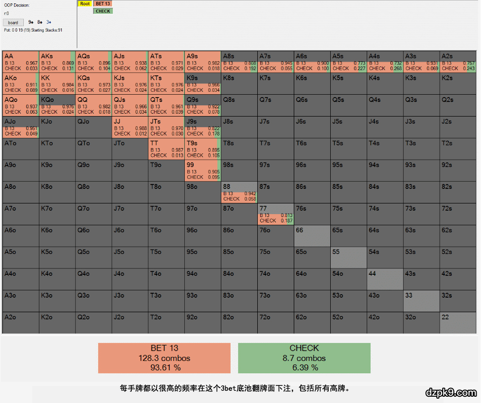 我们来看看PioSolver对于“按钮玩家率先加注并跟注小盲玩家3bet后翻牌是9♠ 8♠ 3♦”局面的解决方案。以下是PioSolver认为小盲玩家应该如何在这个翻牌面游戏: