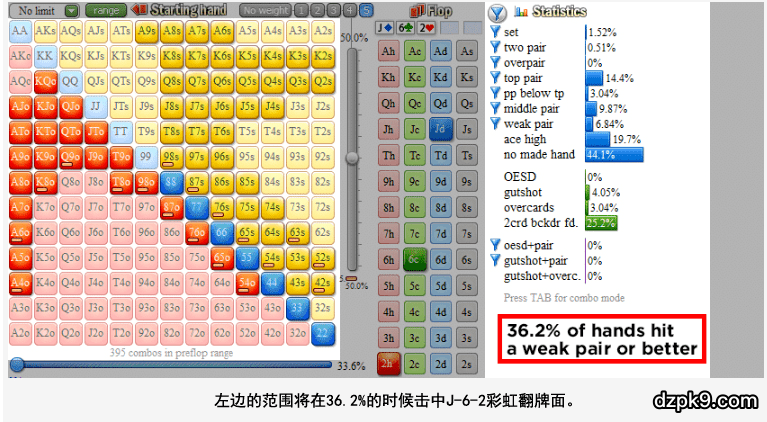 我们看一看大盲玩家对抗按钮玩家加注的标准跟注范围在J ♦ 6♣ 2♥翻牌面拿到一手成手牌的概率: