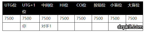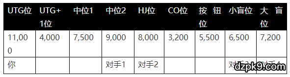 这是WSOP买入2,500刀赛事的第一手牌。你买入得稍晚,因为你刚刚从1,000刀买入的比赛中被淘汰。你的桌子是一个“延迟买入”桌,意思就是桌子上的其他对手也都是和你一样,在比赛开始之后才买入的。通常来说,打延迟买入桌的难度要比正常的桌子高,因为这些人都是职业选手,一般都参加过很多比赛。中位对手1是一位非常强的选手,前几天的晚上,你跟他打过10/20刀的常规桌。大盲位对手2是个你没见过的年长玩家。