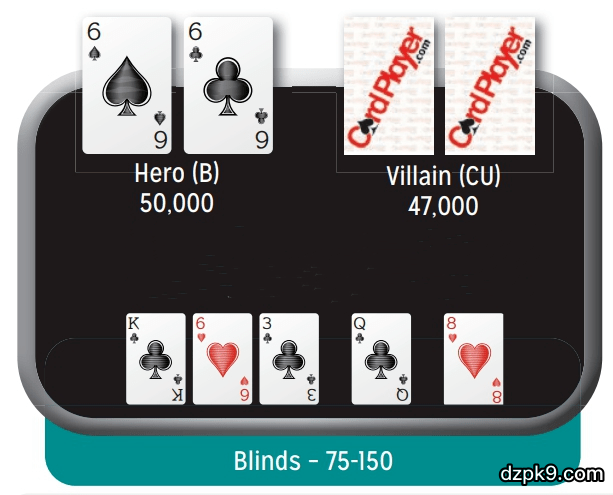 你处在一个3500美元买入扑克锦标赛的早期阶段。这是一张8人桌,盲注是75/150,你有50000筹码。翻前LJ玩家加注到400,CO玩家跟注,你在按钮位置拿着6♠ 6♣。