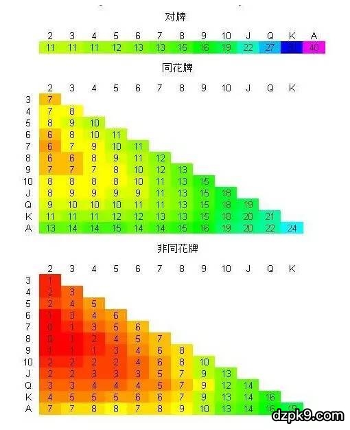 德州扑克悬牌之前如何玩,取决于你拿到的两张起手牌(也称窝牌)的强弱。如果将起手牌的强弱用数字来衡量,最弱的牌值为0,最强的牌值为40,那么德州扑克所有起手牌的强弱值可用下图清楚的表示出来。