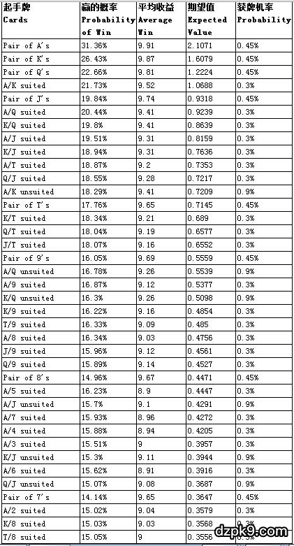 总体来讲,只有那些深绿色,蓝色及紫色的起手牌才值得你去玩,其它牌都应弃掉,除非情况特殊,比如说你是大盲注而又无人加注。如果你处于后面的位置,10点的起手牌你就可以跟注,但如果你处于前面的位置,则需要19点以上的起手牌才可以跟注。