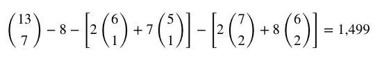 一共有 的方法来选择踢脚,而且对于6张不同大小的牌,共有34种可能会出现同花的组合,所以这些组合中不凑成同花的总数是: