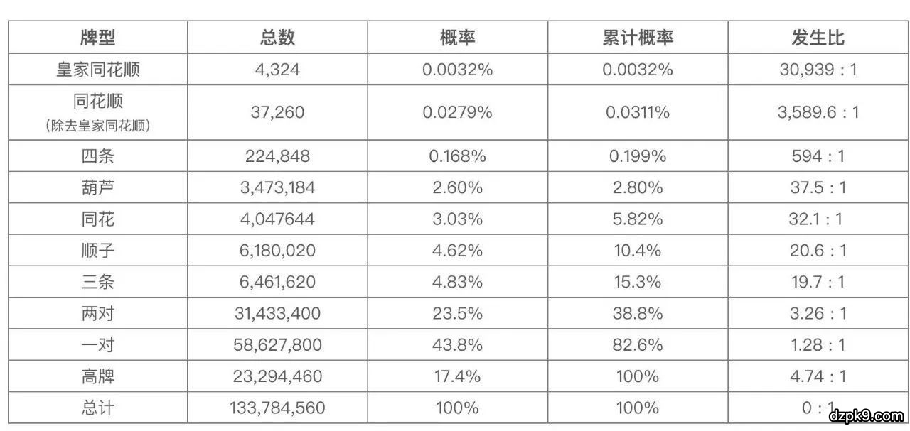 但为什么他们这样排列?为什么同花比顺子大?恐怕这个问题困扰过无数新手。事实上这一切都有数学原理: