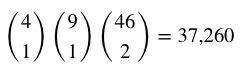 每个同花顺由指定大小的一张牌决定,这些牌从5开始(A-2-3-4-5)到K(0-T-J-Q-K),一共9种,再加上四种不同花色。另外从46张牌中任选两张(除去会组合成皇家同花顺的A):