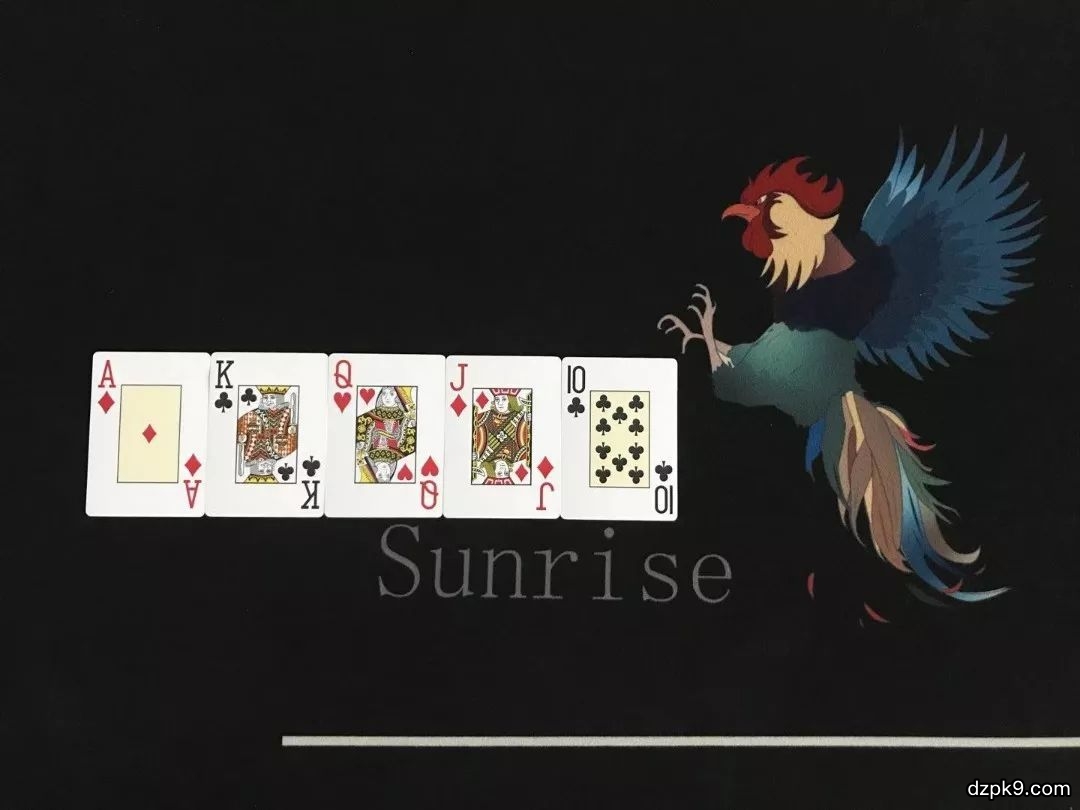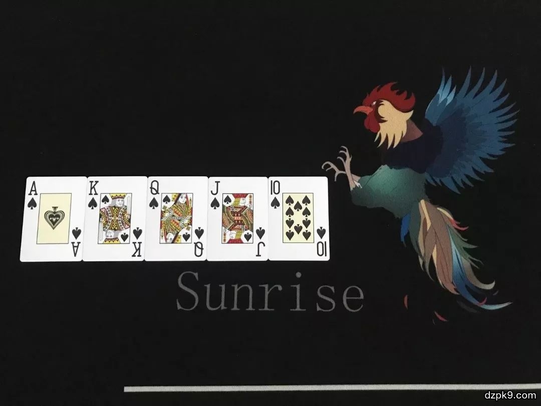 皇家同花顺(同花大顺):同一花色的AKQJ10组成的牌型称为同花大顺是德州扑克当中最大的牌,德州扑克当中只有四副同花大顺。值得注意的是,有人说同花大顺是包含A的同花顺其实不然。因为在德州扑克中,同一花色的A2345其实是最小的同花顺。
