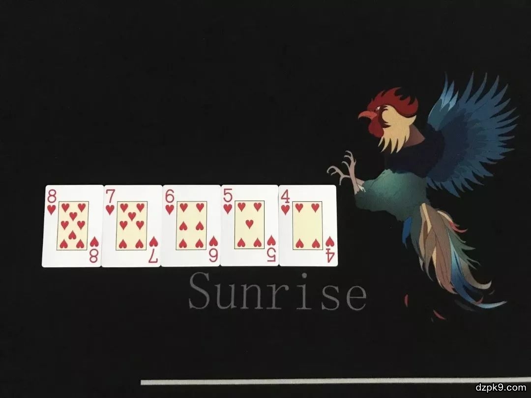 顺子:也叫做蛇,是连在一起的五张牌,只是由于不是同一花色的原因,所以只能是顺子。