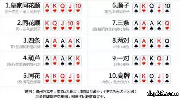 总的来说,德扑是用自己手中的两张牌和公共池中的五张牌搭配比较大小的游戏,但每轮你需要判断牌面选择放弃或者继续下注来保持继续游戏的资格。一个字,德扑就是博弈。德扑大小的顺序是: