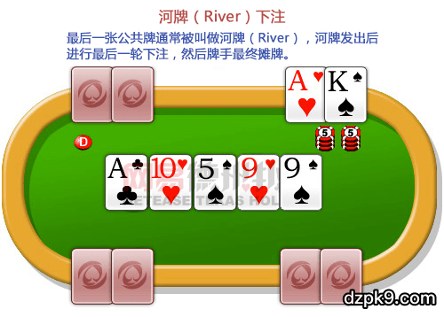 河牌(River):最后一张公共牌被称为“River”,这也是最后一个投注轮,最后的摊牌。