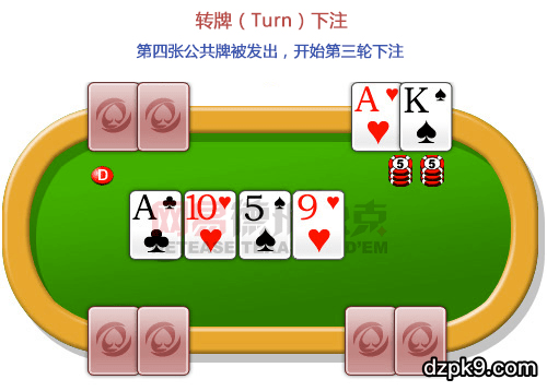 转牌(Turn):再切一张牌,发出第四张公共牌,被称为“Turn”,新一个投注轮又开始了。