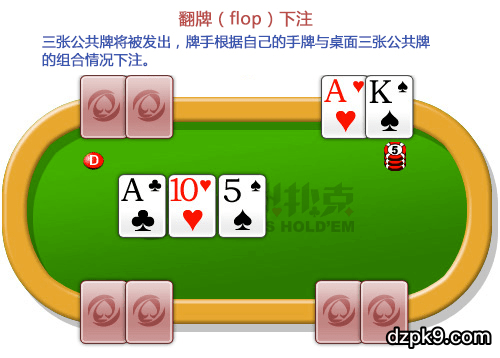 翻牌(Flop):切掉一张牌,桌面上会发出三张公共牌,新一轮投注开始。