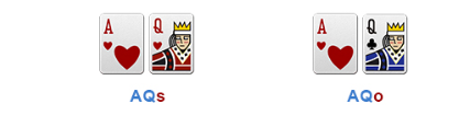 相同花色(suited):如AQs代表AQ两张牌相同花色,包括四种组合。
