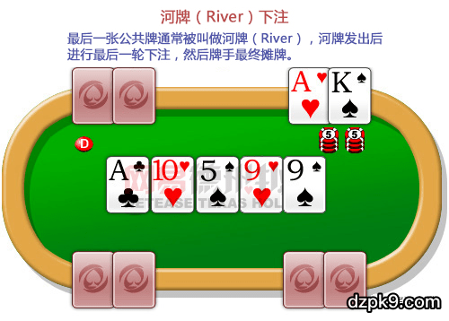河牌(River):最后一张公共牌被称为“River”,这也是最后一个投注轮,最后的摊牌。