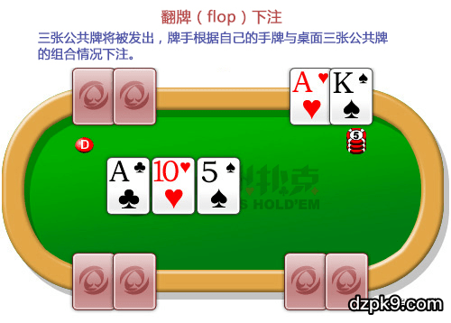 翻牌(Flop):切掉一张牌,桌面上会发出三张公共牌,新一轮投注开始。
