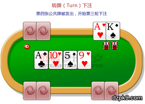 转牌(Turn):再切一张牌,发出第四张公共牌,被称为“Turn”,新一个投注轮又开始了。