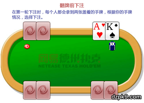 翻牌前:两张底牌,牌面朝下,第一投注轮开始。在每一名玩家都获得两张底牌后,第一投注轮就开始,由大盲注左边的第一名玩家开始行动,他有三个选择:
