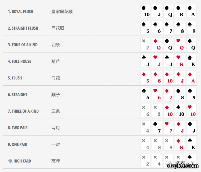 剩余握有底牌的玩家,将会翻牌,而握有最佳组合的五张牌的玩家,将赢得所有的投注。
