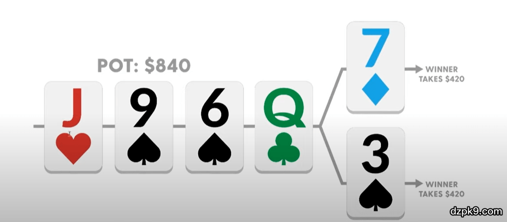 △我们来看图片上这个例子,底池是840刀。第一次发河牌是7♦,赢家拿走420刀,第二次发河牌是3♠,赢家拿走另外420刀。