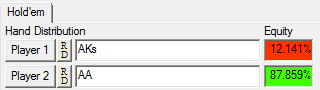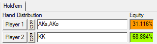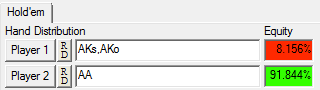 AK几乎和AA、KK一样好吗?回答是响亮的“不”。我们来看看统计数据。你可以看到,非同花AK和AA对抗处于超级下风:
