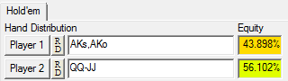 即使是比AA、KK稍小的对子,比如QQ和JJ,对抗AK也只是稍占上风。