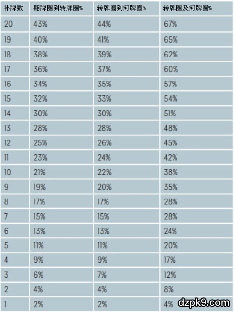 3张构成顶对的补牌。如果你完成了顶对,你可能输给更好成手牌。