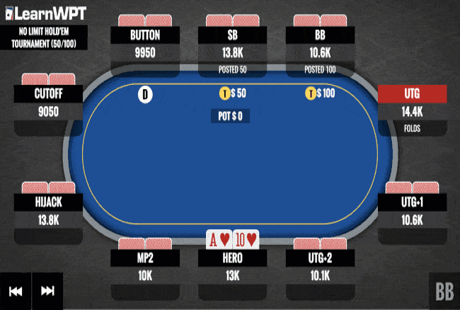 这是某个扑克锦标赛中的一局牌。当时盲注是50/100,桌上玩家筹码量如图。翻前,你在MP1位置用A♥T♥率先加注到300,然后得到了包括大、小盲玩家在内的五个牌手的跟注。底池现在有1800筹码。