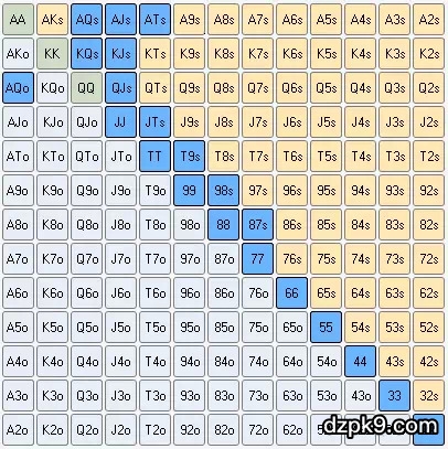 庄家面对中位加注选择跟注(10.7%):JJ-33, AKo-AQo, AQs-ATs, KQs-KTs, QJs-QTs, JTs-J9s,T9s, 98s, 87s, 76s, 65s, 54s