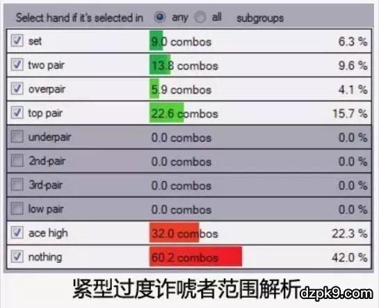 因为在翻牌圈和转牌圈构建其范围的方式,松型过度诈唬者的下注范围到了河牌圈将有很大差异。以下是一个模拟的对手河牌圈下注范围: