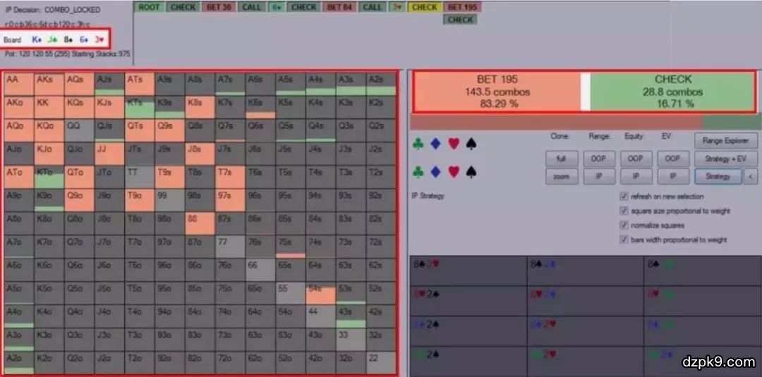 这种对手较难对付。他们在每个回合都有很高的持续下注频率,但我们似乎不能经常逮到他诈唬。对于之前的牌例(K♦J♣8♠6♦3♥公共牌面), 以下是对手的河牌圈范围:
