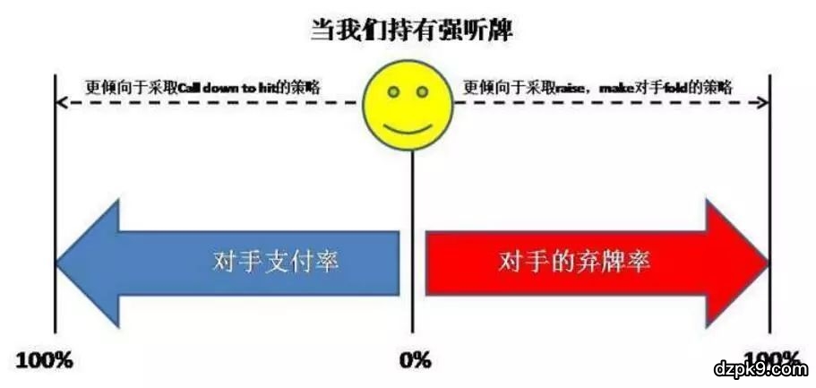 对手的弃牌率越高,我们越倾向于用强听牌在翻牌或者转牌做semi-bluff(半诈唬)。而对手的弃牌率越低,我们越倾向于采取call down to hit的策略。