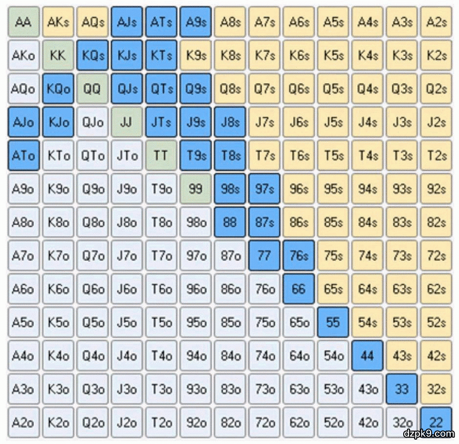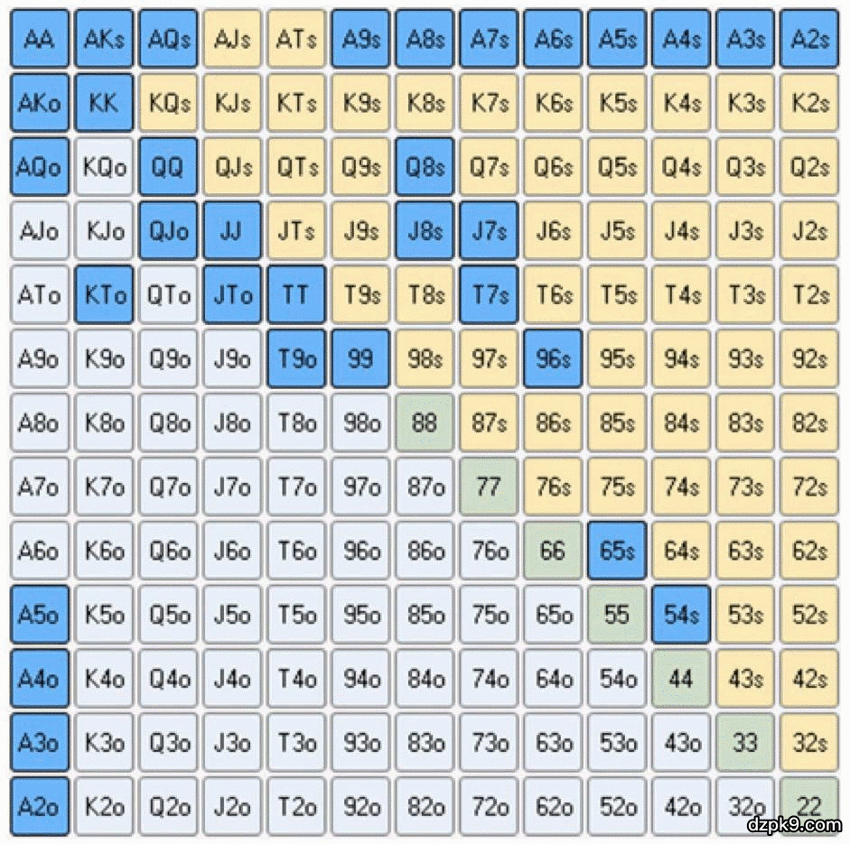 你应该总是用顶端范围的牌去做再加注,但有时候用不算太强牌去跟注,范围如下: