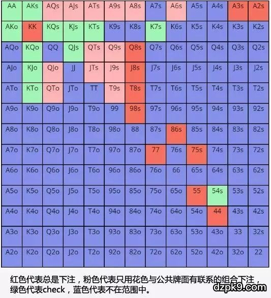 因为对手加注,他很可能有一手强牌或可玩牌。但他是在后面位置加注,这可能意味着他有一个相对较宽的范围。我们可以推测他的范围是:22+,A2s+,K7s+,Q8s+,J8s+,97s+,86s+,75s+,65s,54s,ATo+,KTo+,QTo+,JTo。如下图所示: