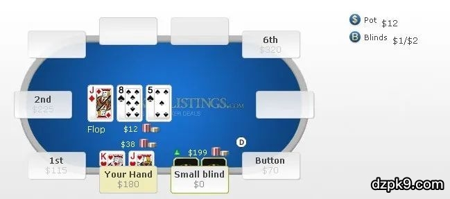 在线6人桌,NL1/2,这手牌前面玩家弃牌,小盲位加注到$6,他是一个比较凶的常客玩家,你和他有大量的交手记录,同时他也知道你玩的不错,也比较凶,你在大盲位手持K♥J♥跟注