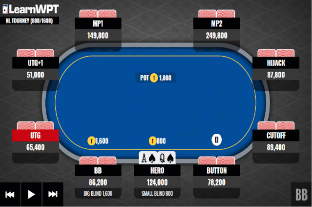 这手牌来自一个无限德州扑克锦标赛。当时盲注为800/1600。桌上玩家筹码量如图所示。