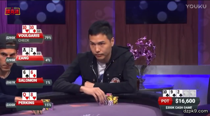 而且在前面有平跟入池者后,你也平跟的好处是鼓励了SB和BB入池,因为他们已经投入了一定筹码,SB和BB的入池能为你买暗三条提供更好的赔率。其次,当你在翻牌后击中暗三条后,尽可能去跟注对手的下注,这么做的好处是鼓励了其他对手的跟注。比如在AXX的翻牌面,因为大家都是平跟盲注入池的,所以很大概率牌力都不强,在一位玩家下注后,你用暗三条跟注,牌力得到了很好的隐藏,其他持有A的对手很难判断你到底是击中了A,还是拿着中对或者其他牌型跟注,而且底池过小,持有A的玩家至少是会跟注一条街的。在这样的翻牌圈加注对于你来说损失了很多价值。
