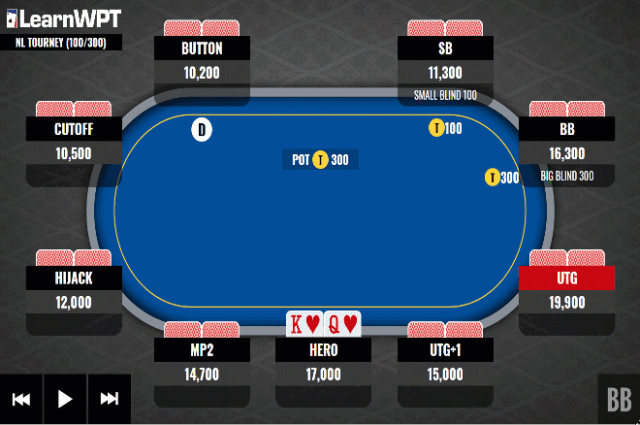 如果我们对UTG+1玩家的持续下注全压,他将可能放弃一手不错胜率的牌。对我们来说,拿下一个无竞争的底池给我们增加50%的筹码量是一个极好的结果。