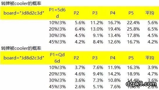 除了天花被cooler,我们还很常常见到,转牌抽出花被cooler,这个概率又有多大呢?